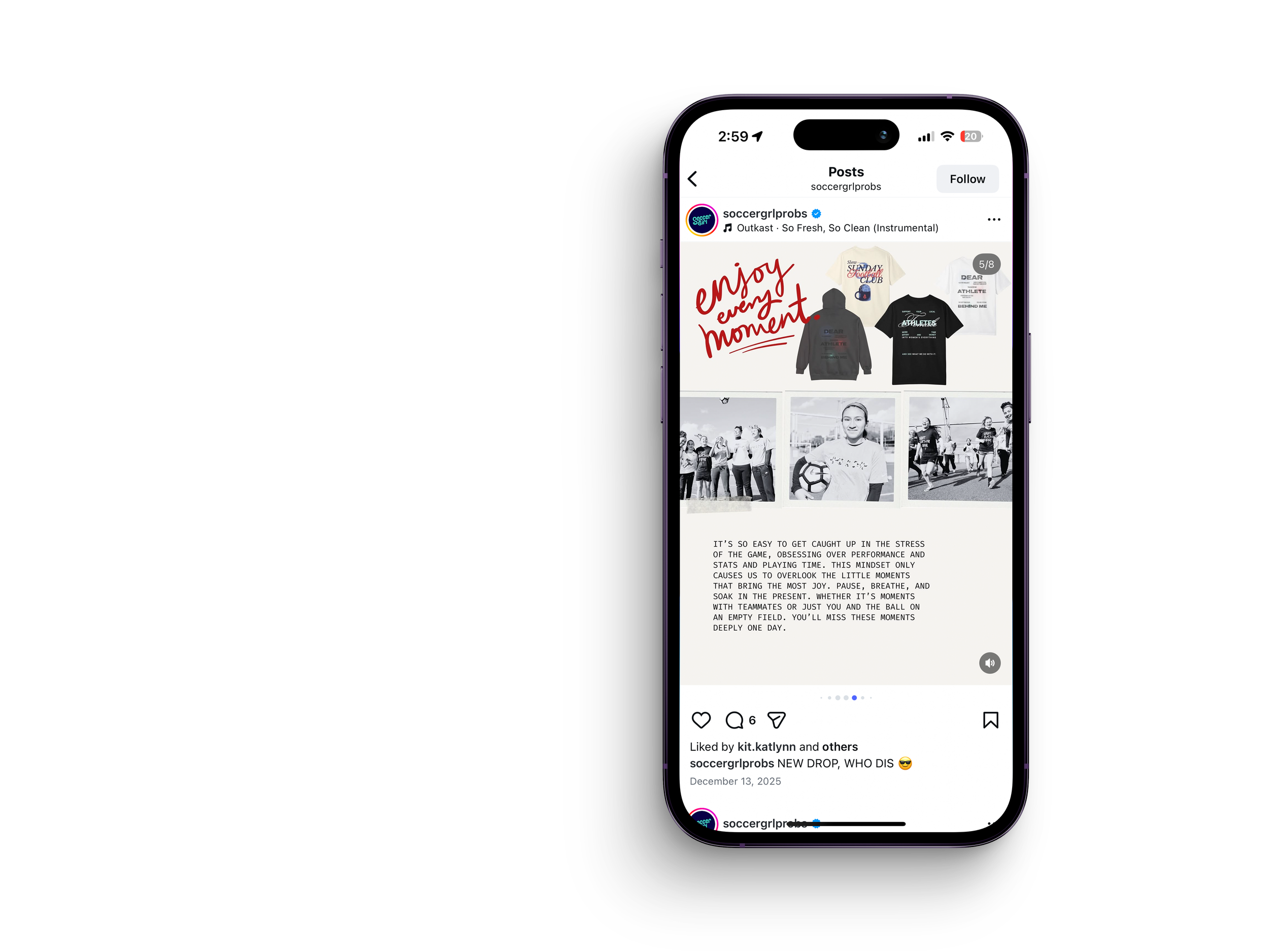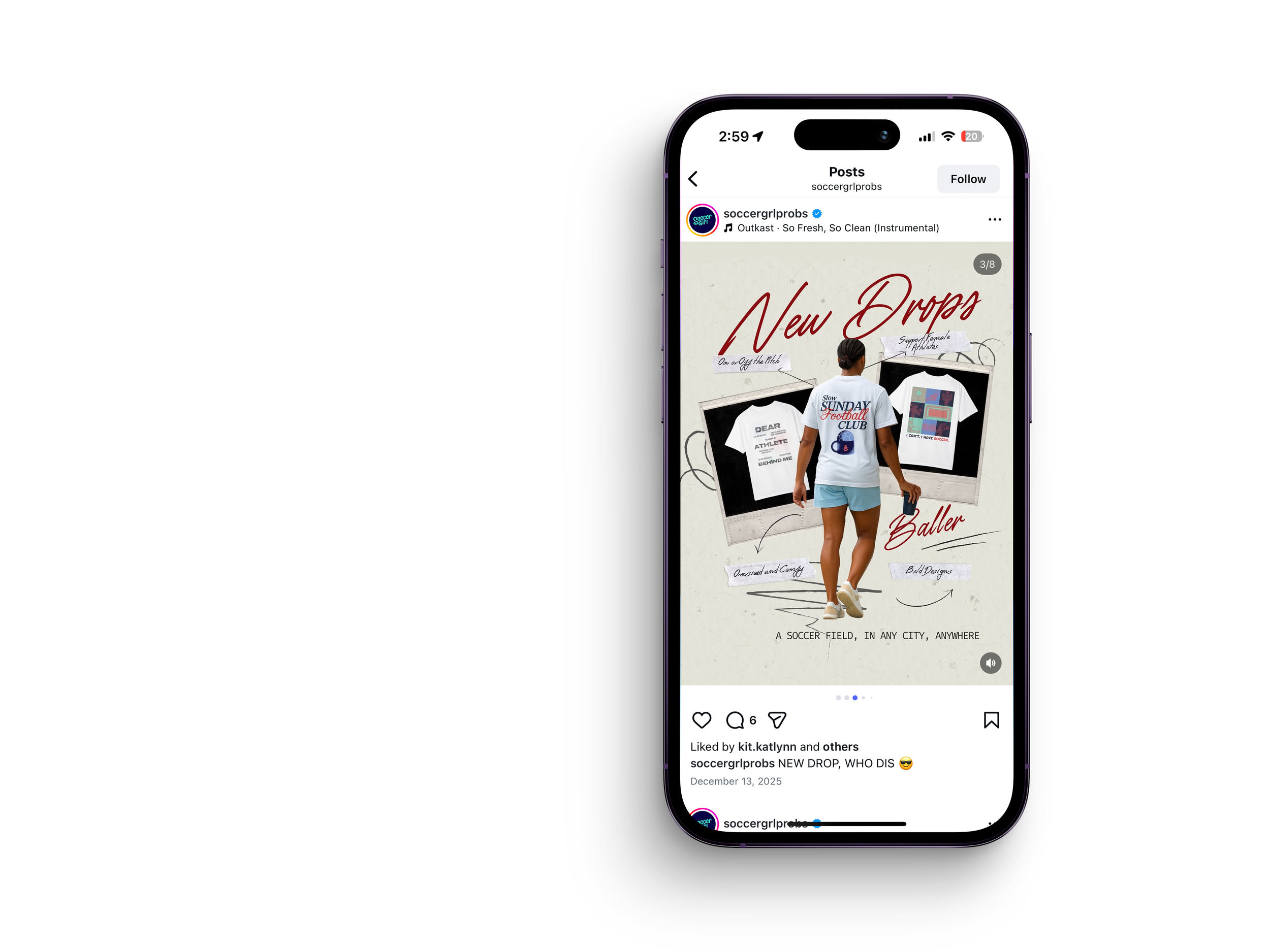 *DISCLAIMER: THESE SOCIAL POSTS WERE NOT DESIGNED BY ME. THIS IS JUST A VISUAL OF HOW THE MERCH I DESIGNED APPEARED ON SOCCER GIRL’S SOCIALS.